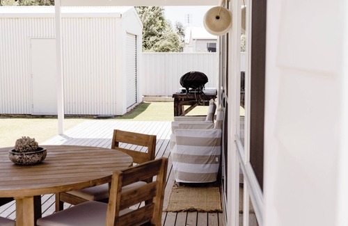 outdoors, enjoy the hot outdoor shower, a sheltered outdoor deck with a weber bbq and a green lawn The backyard is fully fenced.