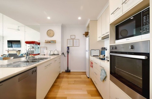 both modern bathrooms feature stone vanities, glass showers and in the master, a full-sized bath A separate toilet and vanity are also located off the laundry, and luxury little toiletries are provided on arrival.