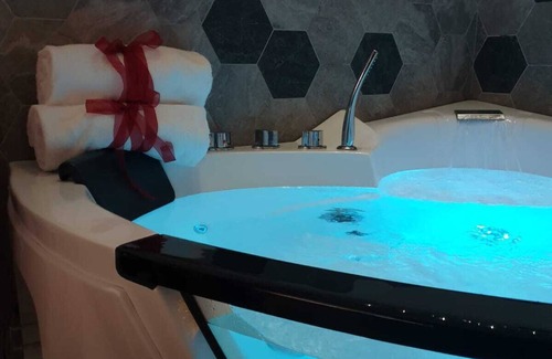 while you're here, you can enjoy all the comforts of home and more, including a jetted bathtub and wifi, as well as a bidet and air conditioning Other amenities include towels, soap, and a hair dryer.