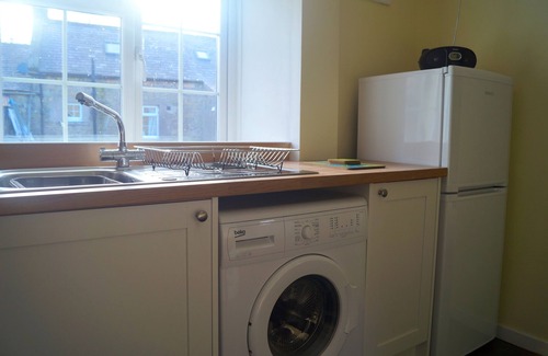 the kitchen is well equipped including a microwave, electric oven fridge freezer and washing machine There is a small table which can seat 4. The bathroom is downstairs and it has a shower over the bath.