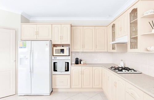 portacot (guests need to bring all bedding to use) Main bathroom with 3-way access, bath, separate walk-in shower & vanity; Separate toilet; Ensuite bathroom adjoining master queen bedroom with spa bath, walk-in shower & toilet. Ducted air-conditioning throughout; Ceiling fans in lounge room. Open plan living area comprising lounge room, dining & kitchen with direct access to rear of house. Large television with USB & HDMI ports in lounge room; Highchair; Toys & games. Fully-equipped kitchen with gas cooktop, electric oven, microwave, coffee machine (guests need to bring Nespresso compatible pods), & large fridge/freezer; Small kitchen appliances including food processor, electric frypan, milkshake maker & electric grill. Top load washing machine; Iron; Ironing board. Undercover enclosed entertaining area at side of house with dining seating; Weber Q gas barbecue. Secure rear yard with access to ponton & marina frontage; Marina pontoon is not available for guests to use for boats. Off-street parking for 2 cars or 1 car & 1 boat in driveway; Secure garage parking for 2 cars. Sorry, pets not permitted..