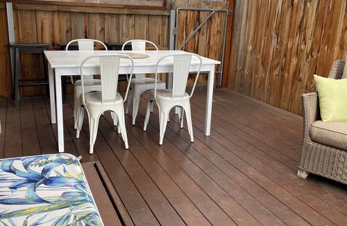 - elevated secure & private decked outdoor area under a pergola with table & chairs shed with 2 kids bikes, a scooter, helmets & beach toys