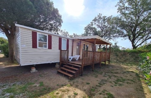 Unique on the campsite, this air-conditioned mobile home of 40 m2, with 2 terraces of 20 m2, each, with open views of the Canigou, and the St Nazaire nature reserve. Equipped, washing machine, TV, vacuum cleaner, iron, board games, baby bed, which can accommodate 8 people, awaits you at the top-of-the-range Mar-Estang campsite for well-deserved holidays, located in an exceptional environment. This beautiful upscale mobile home, is composed of a large living room, 3 bedrooms, 2 shower rooms, 2 toilets. The beach is accessible on foot directly from the campsite, with no road to cross, and you will benefit from infrastructure and an aquatic complex at the top. Festive atmosphere in the evening, to be enjoyed without moderation.