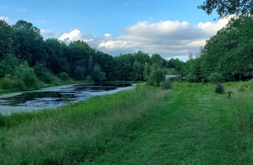 Experience rustic luxury in our large canvas wall tent for a truly off-grid camping experience on 600 square feet of space. Sleeps six people in two queen beds and two cots, linens included with an attached private outdoor toilet room and shower area. The Tent is the perfect retreat away from all the noise and bustle for solitude, writing/creating or connecting with friends at this elegant and peaceful hike-in site only 500 feet around a serene pond.