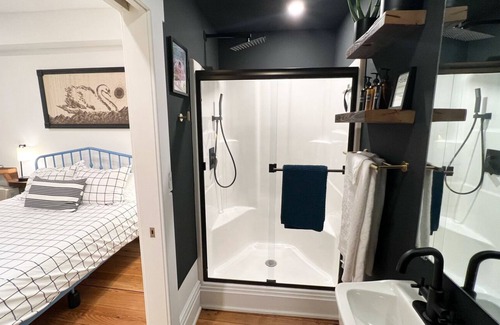 enjoy our this private apartment for it’s rain shower head, high-speed wifi, comfy bed, on demand hot water, complimentary coffee (french press!) and full kitchen with copper countertops