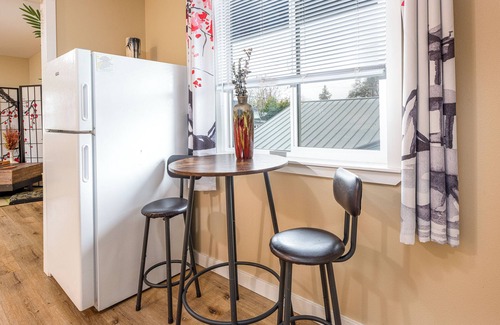 audrey enters into a full kitchen including a four person dining space Chandeliers bathe you in golden light, as you ready at the vintage vanity. A queen sized memory foam bed, loveseat, record player, and vibrant bathroom with standup shower complete the space. There is an additional twin sized daybed, and a twin sized trundle, for two additional guests.