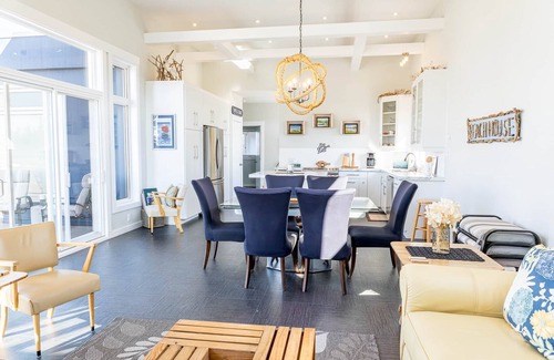 step inside to a bright, airy space where contemporary comfort meets coastal charm The fully equipped kitchen includes all standard appliances you'll need to prepare meals with ease, plus both a drip coffee maker and French press to start your mornings right. The dining and living area, complete with a cozy propane fireplace, provides a warm and inviting atmosphere. Large windows flood the space with light and offer glimpses of the surrounding landscape.