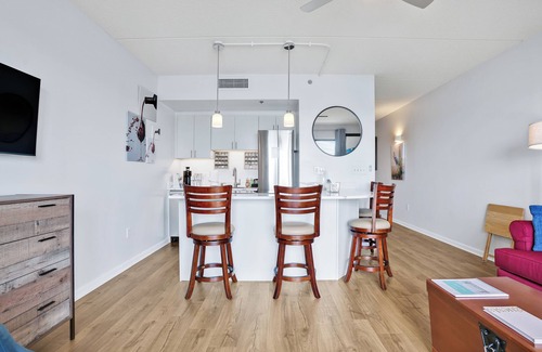 the fully remodeled kitchen is a dream to cook in, with a sleek induction cooktop and a wraparound counter that seats four — perfect for morning coffee or a laid-back dinner with a view The open-concept design flows straight toward floor-to-ceiling sliding doors that lead to your private balcony, where the sunsets paint the sky over the USS North Carolina every evening.