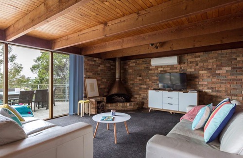 this inviting lounge and dining area provides seamless access to a balcony with dining options, a gas bbq, and stunning sea views, including the night lights of arthurs seat The kitchen is equipped with Fisher & Paykel electric hotplates and an oven, offering picturesque bay glimpses from the living room. Enjoy year-round comfort with split system heating and cooling, cozy up by the open fire on cooler evenings, and use the telescope to watch the ships on Port Phillip Bay.