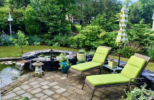outdoors: landscaped grounds are surrounded by mature shade trees, stone walls, perennial gardens and fruiting blueberry bushes (pick your fill in july and early august) The backyard is fenced and private. From the sunroom, step outdoors to the covered stone patio and dramatic koi pond with waterfall. The pond abuts the patio and is covered with a net for safety, however small children should be supervised. The patio has lounge chairs and all-weather wicker dining set that seats four. Weber gas grill. Carriage House has an additional patio with Weber grille and dining table that seats 4.