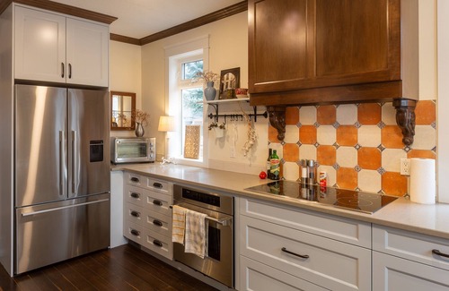 we have lovingly restored this 117 yr-old home and added coffered ceilings, warmed porcelain floors, a modern italian kitchen, salvaged brick chimney, and glistening chandeliers