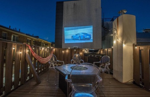 roof deck: 4 chairs, 1 table, 1 hammock, 1 projector