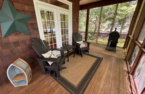 our large fenced-in back lawn is perfect for running around playing tag, chasing fireflies, roasting marshmallows in the in-ground fire-pit or squaring off in a game of giant jenga, horseshoes or corn hole (all provided!) under the shade of the sycamore trees that border the lake Relax on the wrap-around screened-in porch – where we bet you’ll spend the majority of your time – with unobstructed views of our boathouse and Lake Rabun. You and your guests can enjoy the peaceful calm of “The Narrows” and its no-wake zone, making swimming and water recreation worry-free. Explore the water via our 3-person, 17-foot canoe and 1-person, 15-foot kayak, or stay grounded and make use of our charcoal grill and the boathouse's lounge chairs, dining table and chairs and porch swing.