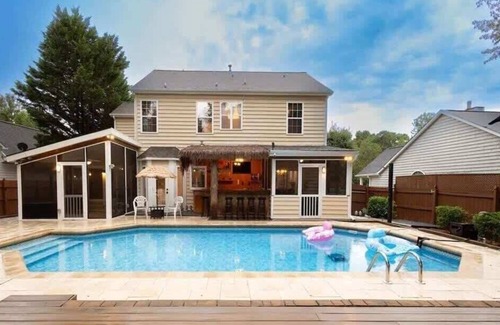 come stay at charlotte's ultimate staycay home featuring 4 separate outdoor areas surrounding an amazing pool Also literally around the pool are a tiki bar, outdoor kitchenette, grill, & fire pit. The location is perfect as it’s just minutes to the Charlotte Motor Speedway, PNC Amphitheater, Concord Mills Mall, University City area and less than 20 minutes to uptown Charlotte. Conveniently located right off I-85 and 485. Enjoy 2 living rooms, 6 dining areas, 4 themed bedrooms, & a game room.