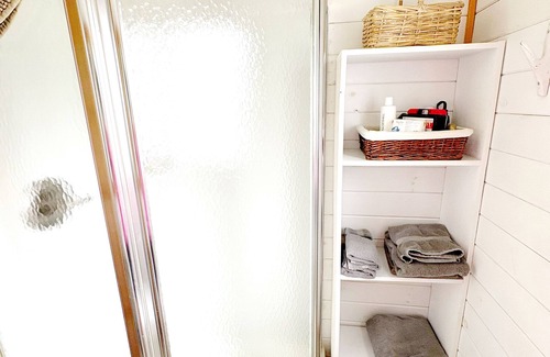 the bedroom has a comfy queen bed and the tv with roku streaming device, convenient for binge watching your favorite shows The bathroom is just off the bedroom and has a stall shower for minimal square footage.