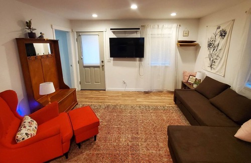 enjoy a private bedroom, cozy loft with a full-size bed, and a queen pullout couch in the living room Little Blue House also includes a lightly stocked pantry and full kitchen, as well as a full washer and dryer, and a 3/4 bath..