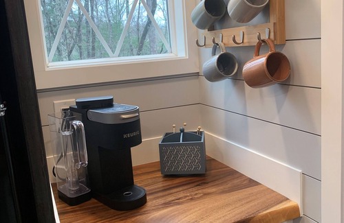 This tiny home has big luxury. It has a full kitchen, living room, closet space, and a queen bed in the loft. The deck is covered and sits on a private spot overlooking the woods. You will love this modern little home away from home. A tiny house on a private little street with 5 different cottages. Each one has its own parking and private space..