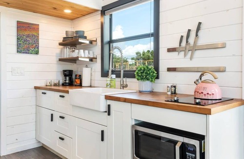 this custom built “tiny home” has all the features of a regular house The main level has a sitting area with sofa. The full kitchen offers microwave/oven, electric cooktop, refrigerator and farmhouse sink. There is a full private bathroom with a shower, vanity/sink and a toilet inside each tiny house. The stairs lead to a cozy sleeping loft with queen bed. There is also a wooden deck with built in benches. you will love this quaint, cozy home as a nice getaway!