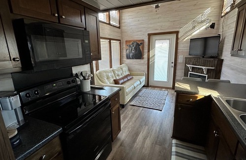 Enjoy this unique and serene tiny house getaway on a 50-acre farm. Cute animals at every turn, including alpacas, goats, ponies, sheep, horses, ducks, chickens, donkey, cows, and more. Family and pet friendly. We hope to see you soon!.
