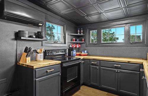 ▻ kitchen and dining area - with a dining set and modern appliances (keurig coffee maker, blender, microwave, oven, stove, fridge & freezer), cookware and silverware
