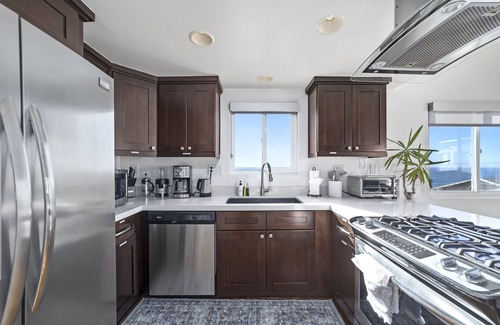 this top-floor newly renovated condo offers an unforgettable coastal escape with views from catalina island to the malibu mountains The unit provides comfortable sleeping accommodations for up to four guests (2 queen beds), with spacious, tastefully decorated bedrooms and cozy linens to ensure a good night's rest. Each bedroom can utilize their own updated bathroom, ensuring comfort, privacy and convenience. The fully-equipped open-concept kitchen has everything you need to prepare delicious meals from home, complete with modern applications, all the necessary cookware and glassware, a 6 seater dining table as well as 3 kitchen bar stools. On the private balcony, you will find a propane grill and a small table so you can dine alfresco. There is also an indoor gas fireplace if you want to snuggle up on the couch and get cozy on those breezy winter nights. With our high speed (1 Gig) WI-Fi and two smart TVs, you can comfortably work and stay connected from home during your stay.