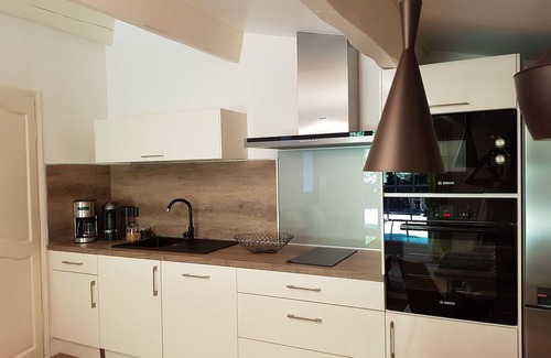 graziella and rémy offers a 43 m² furnished apartment with your own entrance, your private green space, a living room with a sofa "bed express", comfort mattress, samsung tv, a fully equipped kitchen: whirpool fridge, bosch microwave oven and pyrolysis oven, electrolux 2-burner induction cooker, 15-place-dishwasher rosières .. one bedroom with bed, 160x200 shape memory mattress, dressing room, bathroom and separate toilet, private garden furniture .