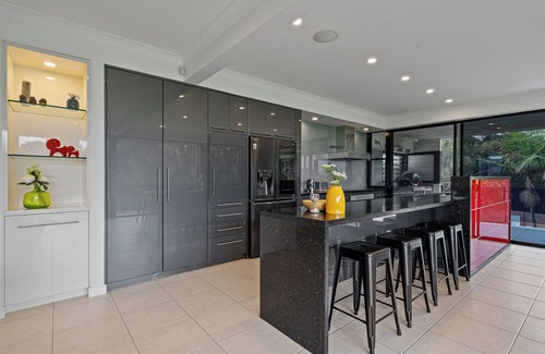 our home is a two-storey, 6 bedrooms, beachfront dream The floorplan consists of an open plan kitchen that doubles up as an entertaining space. There is also has a huge deck overlooking the the pool, spa as well as the trees surrounded by the lake at the back of the home (direct access). a simple stroll down side gate, through the public park and you are on the beach, the perfect location!