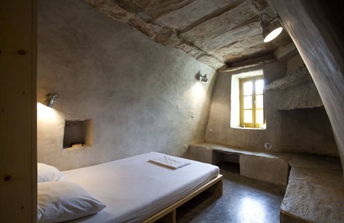feel cozy and inspired as soon as you enter the house: interior walls are corbelled inwards and are topped by a series of slabs which form the ceilings; the cement mortar floor, the joint stone walls, the wooden furniture, doors & windows reveal the beauty of craftmanship, simplicity and practicality