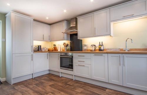 the ground floor: the attractive living room is warm and cosy and is furnished with a 50″ smart tv with netflix, 2 sofas, an armchair, and a coffee table The separate dining room adjoining the kitchen offers guests a dining table and chairs, there are occasional chairs for extra relaxation. The fully fitted bright modern kitchen is equipped with plenty of cupboard space, an electric oven and hob, dishwasher, fridge/freezer, kettle, microwave, toaster, and coffee machine. There is a door to the garden. The cloakroom with toilet and basin also doubles as a utility room with a washing machine and tumble dryer. Space for outdoor clothing. The first floor: The very attractively presented master bedroom has large modern skylight windows allowing great natural light to enter the room. There are bedside cabinets with reading lamps, a clothes hanging area, a chair, an en suite shower cubicle with a toilet, and a wash basin. The second bedroom can be set up with a Superking bed or twin 3′ beds. There are bedside cabinets with reading lamps, and an en suite with a shower, wash basin, and toilet. The default setup is 2 single beds – if SuperKing is required please detail when booking. Outside the cottage, the guests benefit from a private garden to the rear. Slightly sloping rural cottage gardens, mainly grass and mature shrubs. Small drop (approximately 2′) from grassed area to gravel below (toddlers beware). On-street parking is free of charge immediately outside the property. The house has electric heating throughout with electric hot water heating. There is an iron and board and hairdryer.