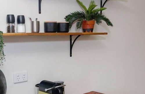 the kitchen is compact yet well-equipped with everything you need, including a full oven, gas cooktop, microwave, nespresso machine, and all the essentials for cooking or reheating takeaways from local favourites The dining nook is perfect for sipping your morning brew or working remotely, with leafy garden views and colourful, eclectic chairs that add a pop of personality.