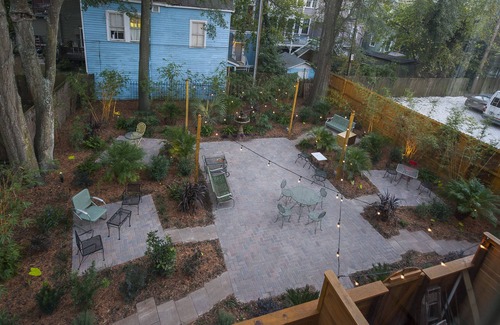 delight in the rear courtyard, our crown jewel This tropical oasis is ideal for morning coffee, afternoon cocktails, dining al fresco, and enjoying the warm Savannah nights in a gently-lit dream garden.