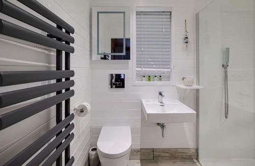 it includes a self contained bathroom with walk in shower and heated towel rail The living space is open plan with large sliding doors out to the decking area, giving the feel of living in the tree tops. The living space includes a wood burning stove, large comfortable settee, chair and TV.