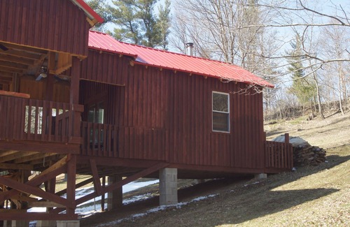 In the corner of the property is a newly erected camp 12*18 feet enclosed with a loft bedroom and sleeping areas below.It has running water,an outhouse with toilet and electricity for small things.Recently created Bath House with Wood fired Hot Tub.Connected to the enclosed area is covered porch 12 * 24 feet long with a pic-nic table.Heat is provided by a wood stove..Fire ring and table are also outside on the grounds.seasoned Firewood is available at a reasonable price. Make sure to bring fire starters and whatever you would bring for camping.