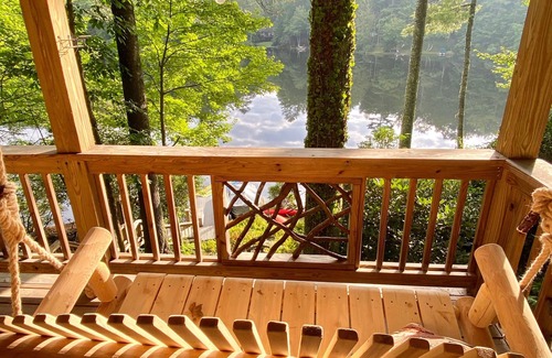 what could be better for a getaway than a luxury lakefront treehouse, extra comfortable bedrooms, hot tub overlooking the lake Wake up to mountain air, take in the sounds of our birds and wildlife, the beauty among the trees and glistening lake below. The house is perched on a lakeside bank, blanketed by fern and rhododendrons, among pine, hickory, maple, and mountain laurel, We have 2 kayaks, one double canoe and one 15 ft lily pad as our flotilla. An hour of steady paddling gets you to the far corners and back, passing small hidden waterfalls and streams that feed it after a good rain.