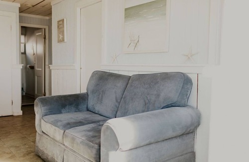 the cottage has a living room overlooking the ocean, fully stockedeat-in kitchen and a bathroom with stall shower There are three bedrooms, two with a full sized bed and one with a single set of twin bunk beds. The living space is cozy and the wraparound deck offers additional space to enjoy the sunshine and salty air.