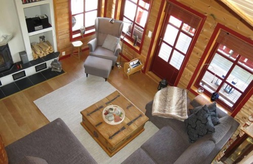 "troll", 6-room house 95 m2 on 2 levels Living/sleeping room with 1 sofabed, Scandinavian wood stove, dining table, satellite TV, international TV channels, CD-player and DVD. Exit to the terrace. 1 room with 1 double bed (150 cm, length 200 cm). 1 room with 3 sleeping facilities (120 cm). Open kitchen (oven, dishwasher, 4 ceramic glass hob hotplates, kettle, freezer, grill, electric coffee machine). Shower/WC, Sauna. Upper floor: living/sleeping room with 1 double sofabed (150 cm, length 200 cm), satellite TV, international TV channels and DVD. 1 room with 1 bed (80 cm, length 200 cm). 1 room with 1 bed (80 cm, length 200 cm). Electric heating. Box-room. View of the lake. Facilities: washing machine, baby cot. Please note: non-smoking house. Smoke alarm, fire extinguisher. Freezer approx. 65 l. Bed layout is flexible. There are more sleeping options available than the maximum number of people allowed which may, however, not be exceeded. 924531169