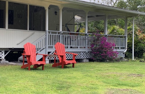 the jungalow is located 16 miles from hilo airport, four miles makai (toward sea) of hwy 130, five miles to nearest mini-market or 8 miles to pahoa, and 20 to volcanos national park This is a quiet and secluded area but it is a jungle out there, so be prepared for wild fowl, coqui, gekkos, some insects and rain. The Jungalow is wide open for natural ventilation and trade winds (no air conditioner). Quiet hours are from dusk to dawn. Owners and 2 cats live on property in a separate unit at the back of the property. Two cars maximum. Ring security camera facing driveway.. 🤙.