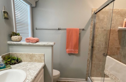 kitchen has double door refrigerator for plenty of food storage, an open breakfast bar with stools, dining table seats 6, and all electric updated appliances Both bedrooms offer queen size beds and storage for your clothing. Master bedroom has its very own private bathroom. Wifi throughout the home. Washer and Dryer is in its own closet in the hallway. Walk out the front door and enjoy a beautiful wrap around patio with wicker seating and tall table with barstools. The breeze from the water and the sight is absolutely breathtakingly beautiful. To get to the private board walk/fishing dock, simply walk a few steps across the narrow street and enjoy. Dock does have porch swing, picnic table, fish cleaning table and pole holders. Can also tie your boat off directly to dock. Weather your trip is for business or pleasure, This is definitely a vacation for the books and one you and your family will remember and be talked about for years to come..