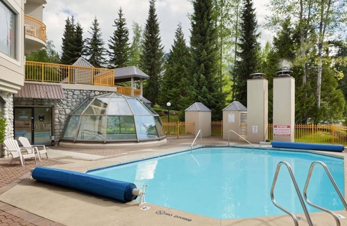 the fully stocked kitchen features stainless steel appliances and has oils and spices provided The spacious living room has ample seating with a flat-screen TV, cozy fireplace and window A/C included. The complex features an outdoor heated pool, large hot tub, gym facility and sauna. situated close to the heart of whistler while being surrounded by quiet mountain views!