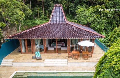 The Tumpang Sari Villa sets well up on the property and offers amazing panoramic views over Bacuit Bay, all the Joglos below, and the main swimming pool. It has two bedrooms, both with ensuite bathrooms, kingsize beds/300 thread count Indian cotton sheets, and the possibility to convert the main salon into a third bedroom with a luxurious pullout couch that becomes a real kingsize bed.