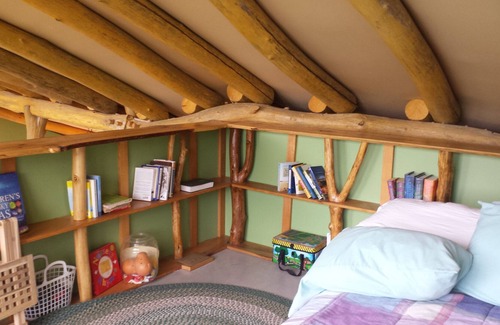 the cabin is a green home with uncompromising beauty and energy efficiency It has a prefabricated round-timber frame and pallet-wall system. The living/dining/kitchen area has a 14’ high ceiling, with dramatic branching timber columns and beams. White oak slab tables and counters add timeless beauty. The custom red oak stairs and railing with buckthorn stiles flows up to the bedroom/loft. The house’s gently curving roof opens up to the south to maximize winter solar heat.
