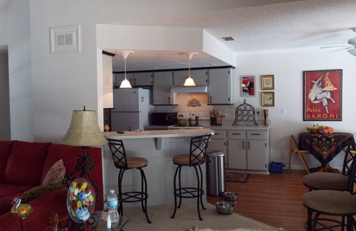 This one-story house features a well equipped kitchen with dining for two and a desk for your computer, etc to hook up to free wi-fi and internet.The two spacious, private bedrooms with baths are separated by a tastefully furnished great room/dining area and a modern kitchen with laminate flooring. The dining area accommodates six people. The bedroom to the right of the great room has a king bed with pillow-top mattress, a large dresser, walk-in closet, linen closet with extra sheets and blankets and an ensuite bathroom with double sinks and tiled shower. The bedroom to the left of the great room and kitchen has a queen bed, dresser, desk, walk-in closet and an outdoor sitting room perfect for curling up with a good book. The bathroom has a shower/tub combination with fully stocked linen closet. Both bedrooms have access to the fully enclosed, screened lanai and private, in-ground pool. The backyard and gardens have a wood, privacy fence on all four sides offering totally privacy for swimming in the pool, lounging and sunning by the pool with a book in one of five chaises or just stargazing after dark. The lanai, within the screened enclosure, is furnished for outdoor living and dining. The house is situated in a quiet, safe neighborhood and is great for walking. We have recently installed a pool heater and the pool deck has been recently painted for your enjoyment. Cost of heated pool: $35.00 per week.