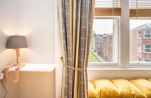 Scott's View Apartment is a stunning seaside holiday apartment, located right on the High Street in North Berwick. There are 2 bedrooms, kitchen and a sitting dining room. The wonderful large south facing bay window in the sitting room offers a sunny spot to watch the going's on in the High Street below and also has views to the sea beyond. This second floor apartment has high ceilings, original features and large picture windows and a wonderful period fire place.