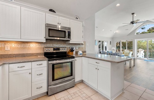 Get rev'd up for your next Outer Banks vacation at Ultra Classic, a charming soundside home in the Monteray Shores community of Corolla. Mediterranean architecture and mature trees provides Ultra Classic with its unique character and seclusion. Enjoy the convenience of having your very own private pool and hot tub right in the backyard! Bring home steaks or the catch of the day and use the picnic area for cookouts. The top-level wrap-around deck is perfect for lounging in the sun, while the screened porch on the mid-level provides shade and protection from the elements. Inside, an open-concept main living area provides plenty of room for everyone to gather. Vaulted ceilings and windows galore make the space feel bright and airy. Prepare meals in the updated kitchen, featuring stainless steel appliances and granite countertops. An additional table for four in the ships watch is the perfect place for puzzles, board games or poker night. Beach-friendly luxury vinyl plank flooring flows throughout the living area and bedrooms. All four bedrooms are conveniently located on the mid-level, and the two king rooms share an updated and spacious Jack-and-Jill bath with walk-in shower.