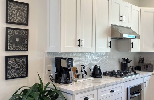 New Modern Construction with Balcony, Cinema Quality Surround Sound, Napoleon Gas Fireplace, Covered Parking. Black out curtains, Samsung Bespoke Washer, Dryer and Refrigerator. Built in microwave and convection oven with air fryer. Large Eternal Marquina Quartz kitchen Island, 10 Mins to Universal Studios and Universal City Walk. Quiet Area close to North Hollywood Red Line Station connecting you to Hollywood Blvd Walk of Fame and the Wax Museum. 20 Mins to DTLA and LA Live. This single family home has two floors. The upper level is where you’ll find the living area kitchen, laundry room and the master suite. The lower level is the Brown Room. There is a queen size bed, and a leather sectional with a pull out sofa bed. This room also has a large Samsung flatscreen TV and ceiling fan. The bathroom is beautifully done with a marble window sill and stand up shower..