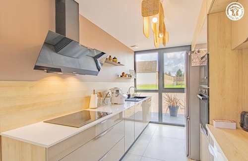 Lovely contemporary residence (built on the site of an old traditional barn), nestled in the quiet "backyard" on the edge of a mini pasture welcoming sheep in season, in the heart of a peaceful little typical & commercial village (including a mini-market). Total tranquility in the heart of unspoiled countryside, in the hollow of a plain of fields of crops & meadows dotted with bucolic rivers & fish ponds, close to several vast wild forests (to explore on foot or mountain bike), a stone's throw from the banks of the Doubs (paradise for kayakers & ultra-renowned fishing site for its famous catfish, pikeperch or carp) remarkable ecosystem partly classified as "Natura 2000 Zone" for its exceptional ornithological reserve rich in 160 species and its very rare plant varieties (various other natural areas protected in ZNIEFF to discover in the territory). Very comfortable gîte. Large living room (78m²). Spacious & bright. High quality equipment. Warm, contemporary country style, blending tradition and modernity in a peaceful, zen atmosphere. Plenty of charm. Cozy, cozy, and comfortable. A large terrace (exposed or shaded) opens onto a pleasant 1000m² garden, planted with lawns and trees (mirabell and fig trees, picking possible), and a pétanque court backing onto a covered terrace equipped with an outdoor lounge. Composition: Semi-detached house (completely independent). Fiber optic Wi-Fi. Heat pump heating. Air conditioning. Ground floor: living room-kitchen-lounge (wine cellar), 2 bedrooms (double bed 160x200cm in each), bathroom (shower), separate toilet. 1st floor: 4 bedrooms (double bed 160x200cm / double bed 160x200cm + extra double sofa bed 150x190cm / double bed 160x200cm / 3 single beds 90x200cm), 2 bathrooms (shower/wc). Land (1000m² / courtyard + garden) + terrace + sheltered terrace + pétanque court + bicycle storage + private parking. Mini-market 2 km. Supermarket 2 km. Amenities 3 km..