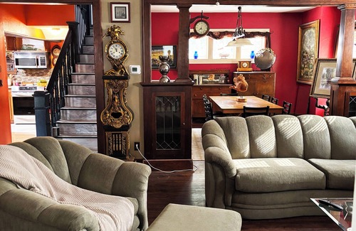 Step into a unique getaway where old-fashioned charm meets vibrant style. This historic home boasts hardwood floors and stately colonnades, mixed with an inviting blend of unique wallpaper and bold colors that make every room feel unforgettable. Furnished for comfort, each space invites you to relax - whether you’re sharing meals in the dining area or enjoying a quiet morning coffee outside on the private patio. a short 6 block walk takes you to shopping, dining and the scenic missouri river!