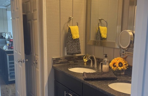 this home has been updated throughout with granite countertops, marble bathroom flooring and beautiful vertical cable railing on the outdoor deck The Master Bedroom has two sets of sliding glass doors directly to the deck and has remote-controlled blinds, so sunrises can be enjoyed with the click of a switch. The 2nd bedroom has twin beds, which works great for kids and singles, alike.