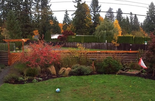 outside the glass side door you will find a wrap-around deck that gives onto your own private garden area and a view of the forest The cottage sits next to our main house and the garden is fully-fenced (we have a big gentle dog) and includes our veggie patch and chicken coop. We look forward to providing you with daily fresh eggs!.