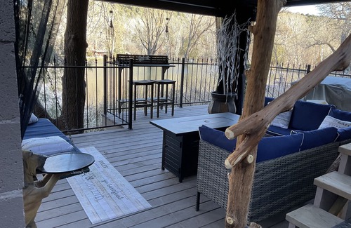 the treehouse has a mini split system for heating and cooling, and on the upstairs balcony is an infrared heater the sits over the outdoor bar that overlooks the 2-acre pond You will have a birdseye view of the ducks, eagles, otters, wildlife and fish jumping on the pond. Yes. The pond is stocked and since it is private, no fishing license is required. From here the sunsets over the top of the mountain on the other side of the East Verde River, and the reflection in the pond is mesmerizing. Don’t forget your camera.